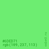 Цвет #6DED71 в цветовой модели RGB обозначается тремя октетами (109, 237, 113) в десятичном формате и #6DED71 в шестнадцатиричном (hex) формате, которые являются интенсивностью красного 109 (hex 6D), интенсивность зелёного 237 (hex ED) и интенсивность синего 113 (hex 71).