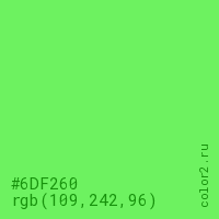 Цвет #6DF260 в цветовой модели RGB обозначается тремя октетами (109, 242, 96) в десятичном формате и #6DF260 в шестнадцатиричном (hex) формате, которые являются интенсивностью красного 109 (hex 6D), интенсивность зелёного 242 (hex F2) и интенсивность синего 96 (hex 60).