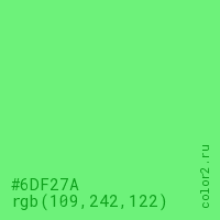 Цвет #6DF27A в цветовой модели RGB обозначается тремя октетами (109, 242, 122) в десятичном формате и #6DF27A в шестнадцатиричном (hex) формате, которые являются интенсивностью красного 109 (hex 6D), интенсивность зелёного 242 (hex F2) и интенсивность синего 122 (hex 7A).