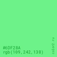 Цвет #6DF28A в цветовой модели RGB обозначается тремя октетами (109, 242, 138) в десятичном формате и #6DF28A в шестнадцатиричном (hex) формате, которые являются интенсивностью красного 109 (hex 6D), интенсивность зелёного 242 (hex F2) и интенсивность синего 138 (hex 8A).