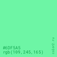 Цвет #6DF5A5 в цветовой модели RGB обозначается тремя октетами (109, 245, 165) в десятичном формате и #6DF5A5 в шестнадцатиричном (hex) формате, которые являются интенсивностью красного 109 (hex 6D), интенсивность зелёного 245 (hex F5) и интенсивность синего 165 (hex A5).