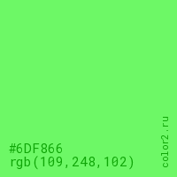 Цвет #6DF866 в цветовой модели RGB обозначается тремя октетами (109, 248, 102) в десятичном формате и #6DF866 в шестнадцатиричном (hex) формате, которые являются интенсивностью красного 109 (hex 6D), интенсивность зелёного 248 (hex F8) и интенсивность синего 102 (hex 66).