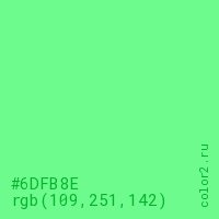 Цвет #6DFB8E в цветовой модели RGB обозначается тремя октетами (109, 251, 142) в десятичном формате и #6DFB8E в шестнадцатиричном (hex) формате, которые являются интенсивностью красного 109 (hex 6D), интенсивность зелёного 251 (hex FB) и интенсивность синего 142 (hex 8E).