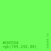Цвет #6DFD58 в цветовой модели RGB обозначается тремя октетами (109, 253, 88) в десятичном формате и #6DFD58 в шестнадцатиричном (hex) формате, которые являются интенсивностью красного 109 (hex 6D), интенсивность зелёного 253 (hex FD) и интенсивность синего 88 (hex 58).