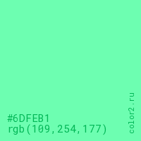 Цвет #6DFEB1 в цветовой модели RGB обозначается тремя октетами (109, 254, 177) в десятичном формате и #6DFEB1 в шестнадцатиричном (hex) формате, которые являются интенсивностью красного 109 (hex 6D), интенсивность зелёного 254 (hex FE) и интенсивность синего 177 (hex B1).