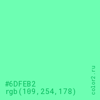 Цвет #6DFEB2 в цветовой модели RGB обозначается тремя октетами (109, 254, 178) в десятичном формате и #6DFEB2 в шестнадцатиричном (hex) формате, которые являются интенсивностью красного 109 (hex 6D), интенсивность зелёного 254 (hex FE) и интенсивность синего 178 (hex B2).