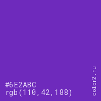 Цвет #6E2ABC в цветовой модели RGB обозначается тремя октетами (110, 42, 188) в десятичном формате и #6E2ABC в шестнадцатиричном (hex) формате, которые являются интенсивностью красного 110 (hex 6E), интенсивность зелёного 42 (hex 2A) и интенсивность синего 188 (hex BC).