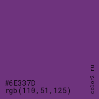 Цвет #6E337D в цветовой модели RGB обозначается тремя октетами (110, 51, 125) в десятичном формате и #6E337D в шестнадцатиричном (hex) формате, которые являются интенсивностью красного 110 (hex 6E), интенсивность зелёного 51 (hex 33) и интенсивность синего 125 (hex 7D).