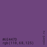 Цвет #6E447D в цветовой модели RGB обозначается тремя октетами (110, 68, 125) в десятичном формате и #6E447D в шестнадцатиричном (hex) формате, которые являются интенсивностью красного 110 (hex 6E), интенсивность зелёного 68 (hex 44) и интенсивность синего 125 (hex 7D).