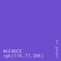 Цвет #6E4DCE в цветовой модели RGB обозначается тремя октетами (110, 77, 206) в десятичном формате и #6E4DCE в шестнадцатиричном (hex) формате, которые являются интенсивностью красного 110 (hex 6E), интенсивность зелёного 77 (hex 4D) и интенсивность синего 206 (hex CE).