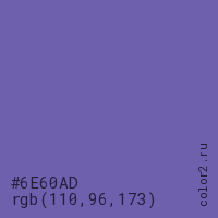 Цвет #6E60AD в цветовой модели RGB обозначается тремя октетами (110, 96, 173) в десятичном формате и #6E60AD в шестнадцатиричном (hex) формате, которые являются интенсивностью красного 110 (hex 6E), интенсивность зелёного 96 (hex 60) и интенсивность синего 173 (hex AD).