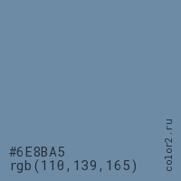 Цвет #6E8BA5 в цветовой модели RGB обозначается тремя октетами (110, 139, 165) в десятичном формате и #6E8BA5 в шестнадцатиричном (hex) формате, которые являются интенсивностью красного 110 (hex 6E), интенсивность зелёного 139 (hex 8B) и интенсивность синего 165 (hex A5).