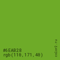 Цвет #6EAB28 в цветовой модели RGB обозначается тремя октетами (110, 171, 40) в десятичном формате и #6EAB28 в шестнадцатиричном (hex) формате, которые являются интенсивностью красного 110 (hex 6E), интенсивность зелёного 171 (hex AB) и интенсивность синего 40 (hex 28).