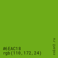 Цвет #6EAC18 в цветовой модели RGB обозначается тремя октетами (110, 172, 24) в десятичном формате и #6EAC18 в шестнадцатиричном (hex) формате, которые являются интенсивностью красного 110 (hex 6E), интенсивность зелёного 172 (hex AC) и интенсивность синего 24 (hex 18).