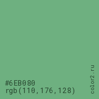 Цвет #6EB080 в цветовой модели RGB обозначается тремя октетами (110, 176, 128) в десятичном формате и #6EB080 в шестнадцатиричном (hex) формате, которые являются интенсивностью красного 110 (hex 6E), интенсивность зелёного 176 (hex B0) и интенсивность синего 128 (hex 80).