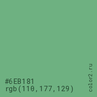 Цвет #6EB181 в цветовой модели RGB обозначается тремя октетами (110, 177, 129) в десятичном формате и #6EB181 в шестнадцатиричном (hex) формате, которые являются интенсивностью красного 110 (hex 6E), интенсивность зелёного 177 (hex B1) и интенсивность синего 129 (hex 81).