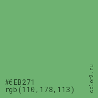 Цвет #6EB271 в цветовой модели RGB обозначается тремя октетами (110, 178, 113) в десятичном формате и #6EB271 в шестнадцатиричном (hex) формате, которые являются интенсивностью красного 110 (hex 6E), интенсивность зелёного 178 (hex B2) и интенсивность синего 113 (hex 71).