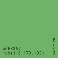 Цвет #6EB367 в цветовой модели RGB обозначается тремя октетами (110, 179, 103) в десятичном формате и #6EB367 в шестнадцатиричном (hex) формате, которые являются интенсивностью красного 110 (hex 6E), интенсивность зелёного 179 (hex B3) и интенсивность синего 103 (hex 67).
