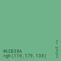 Цвет #6EB38A в цветовой модели RGB обозначается тремя октетами (110, 179, 138) в десятичном формате и #6EB38A в шестнадцатиричном (hex) формате, которые являются интенсивностью красного 110 (hex 6E), интенсивность зелёного 179 (hex B3) и интенсивность синего 138 (hex 8A).