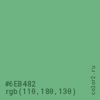 Цвет #6EB482 в цветовой модели RGB обозначается тремя октетами (110, 180, 130) в десятичном формате и #6EB482 в шестнадцатиричном (hex) формате, которые являются интенсивностью красного 110 (hex 6E), интенсивность зелёного 180 (hex B4) и интенсивность синего 130 (hex 82).