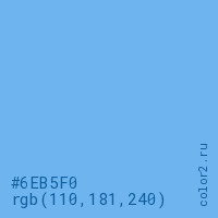 Цвет #6EB5F0 в цветовой модели RGB обозначается тремя октетами (110, 181, 240) в десятичном формате и #6EB5F0 в шестнадцатиричном (hex) формате, которые являются интенсивностью красного 110 (hex 6E), интенсивность зелёного 181 (hex B5) и интенсивность синего 240 (hex F0).