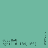 Цвет #6EB8A0 в цветовой модели RGB обозначается тремя октетами (110, 184, 160) в десятичном формате и #6EB8A0 в шестнадцатиричном (hex) формате, которые являются интенсивностью красного 110 (hex 6E), интенсивность зелёного 184 (hex B8) и интенсивность синего 160 (hex A0).