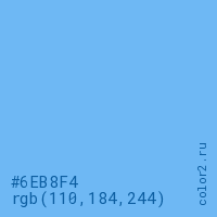 Цвет #6EB8F4 в цветовой модели RGB обозначается тремя октетами (110, 184, 244) в десятичном формате и #6EB8F4 в шестнадцатиричном (hex) формате, которые являются интенсивностью красного 110 (hex 6E), интенсивность зелёного 184 (hex B8) и интенсивность синего 244 (hex F4).