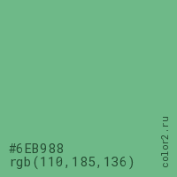 Цвет #6EB988 в цветовой модели RGB обозначается тремя октетами (110, 185, 136) в десятичном формате и #6EB988 в шестнадцатиричном (hex) формате, которые являются интенсивностью красного 110 (hex 6E), интенсивность зелёного 185 (hex B9) и интенсивность синего 136 (hex 88).
