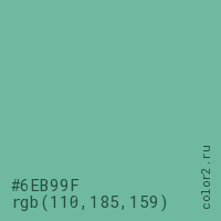 Цвет #6EB99F в цветовой модели RGB обозначается тремя октетами (110, 185, 159) в десятичном формате и #6EB99F в шестнадцатиричном (hex) формате, которые являются интенсивностью красного 110 (hex 6E), интенсивность зелёного 185 (hex B9) и интенсивность синего 159 (hex 9F).