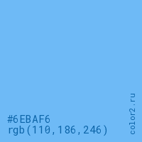 Цвет #6EBAF6 в цветовой модели RGB обозначается тремя октетами (110, 186, 246) в десятичном формате и #6EBAF6 в шестнадцатиричном (hex) формате, которые являются интенсивностью красного 110 (hex 6E), интенсивность зелёного 186 (hex BA) и интенсивность синего 246 (hex F6).