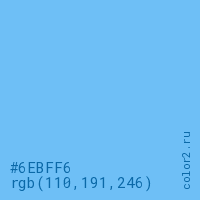 Цвет #6EBFF6 в цветовой модели RGB обозначается тремя октетами (110, 191, 246) в десятичном формате и #6EBFF6 в шестнадцатиричном (hex) формате, которые являются интенсивностью красного 110 (hex 6E), интенсивность зелёного 191 (hex BF) и интенсивность синего 246 (hex F6).