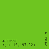 Цвет #6EC520 в цветовой модели RGB обозначается тремя октетами (110, 197, 32) в десятичном формате и #6EC520 в шестнадцатиричном (hex) формате, которые являются интенсивностью красного 110 (hex 6E), интенсивность зелёного 197 (hex C5) и интенсивность синего 32 (hex 20).