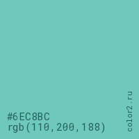 Цвет #6EC8BC в цветовой модели RGB обозначается тремя октетами (110, 200, 188) в десятичном формате и #6EC8BC в шестнадцатиричном (hex) формате, которые являются интенсивностью красного 110 (hex 6E), интенсивность зелёного 200 (hex C8) и интенсивность синего 188 (hex BC).