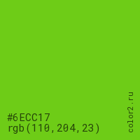 Цвет #6ECC17 в цветовой модели RGB обозначается тремя октетами (110, 204, 23) в десятичном формате и #6ECC17 в шестнадцатиричном (hex) формате, которые являются интенсивностью красного 110 (hex 6E), интенсивность зелёного 204 (hex CC) и интенсивность синего 23 (hex 17).