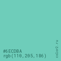 Цвет #6ECDBA в цветовой модели RGB обозначается тремя октетами (110, 205, 186) в десятичном формате и #6ECDBA в шестнадцатиричном (hex) формате, которые являются интенсивностью красного 110 (hex 6E), интенсивность зелёного 205 (hex CD) и интенсивность синего 186 (hex BA).