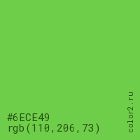 Цвет #6ECE49 в цветовой модели RGB обозначается тремя октетами (110, 206, 73) в десятичном формате и #6ECE49 в шестнадцатиричном (hex) формате, которые являются интенсивностью красного 110 (hex 6E), интенсивность зелёного 206 (hex CE) и интенсивность синего 73 (hex 49).