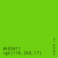 Цвет #6ED011 в цветовой модели RGB обозначается тремя октетами (110, 208, 17) в десятичном формате и #6ED011 в шестнадцатиричном (hex) формате, которые являются интенсивностью красного 110 (hex 6E), интенсивность зелёного 208 (hex D0) и интенсивность синего 17 (hex 11).