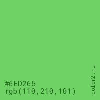 Цвет #6ED265 в цветовой модели RGB обозначается тремя октетами (110, 210, 101) в десятичном формате и #6ED265 в шестнадцатиричном (hex) формате, которые являются интенсивностью красного 110 (hex 6E), интенсивность зелёного 210 (hex D2) и интенсивность синего 101 (hex 65).