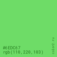 Цвет #6EDC67 в цветовой модели RGB обозначается тремя октетами (110, 220, 103) в десятичном формате и #6EDC67 в шестнадцатиричном (hex) формате, которые являются интенсивностью красного 110 (hex 6E), интенсивность зелёного 220 (hex DC) и интенсивность синего 103 (hex 67).