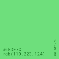 Цвет #6EDF7C в цветовой модели RGB обозначается тремя октетами (110, 223, 124) в десятичном формате и #6EDF7C в шестнадцатиричном (hex) формате, которые являются интенсивностью красного 110 (hex 6E), интенсивность зелёного 223 (hex DF) и интенсивность синего 124 (hex 7C).
