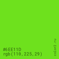 Цвет #6EE11D в цветовой модели RGB обозначается тремя октетами (110, 225, 29) в десятичном формате и #6EE11D в шестнадцатиричном (hex) формате, которые являются интенсивностью красного 110 (hex 6E), интенсивность зелёного 225 (hex E1) и интенсивность синего 29 (hex 1D).