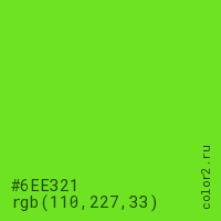Цвет #6EE321 в цветовой модели RGB обозначается тремя октетами (110, 227, 33) в десятичном формате и #6EE321 в шестнадцатиричном (hex) формате, которые являются интенсивностью красного 110 (hex 6E), интенсивность зелёного 227 (hex E3) и интенсивность синего 33 (hex 21).