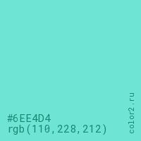 Цвет #6EE4D4 в цветовой модели RGB обозначается тремя октетами (110, 228, 212) в десятичном формате и #6EE4D4 в шестнадцатиричном (hex) формате, которые являются интенсивностью красного 110 (hex 6E), интенсивность зелёного 228 (hex E4) и интенсивность синего 212 (hex D4).
