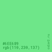 Цвет #6EE689 в цветовой модели RGB обозначается тремя октетами (110, 230, 137) в десятичном формате и #6EE689 в шестнадцатиричном (hex) формате, которые являются интенсивностью красного 110 (hex 6E), интенсивность зелёного 230 (hex E6) и интенсивность синего 137 (hex 89).