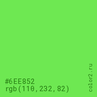 Цвет #6EE852 в цветовой модели RGB обозначается тремя октетами (110, 232, 82) в десятичном формате и #6EE852 в шестнадцатиричном (hex) формате, которые являются интенсивностью красного 110 (hex 6E), интенсивность зелёного 232 (hex E8) и интенсивность синего 82 (hex 52).