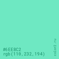Цвет #6EE8C2 в цветовой модели RGB обозначается тремя октетами (110, 232, 194) в десятичном формате и #6EE8C2 в шестнадцатиричном (hex) формате, которые являются интенсивностью красного 110 (hex 6E), интенсивность зелёного 232 (hex E8) и интенсивность синего 194 (hex C2).
