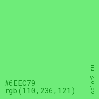 Цвет #6EEC79 в цветовой модели RGB обозначается тремя октетами (110, 236, 121) в десятичном формате и #6EEC79 в шестнадцатиричном (hex) формате, которые являются интенсивностью красного 110 (hex 6E), интенсивность зелёного 236 (hex EC) и интенсивность синего 121 (hex 79).