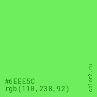 Цвет #6EEE5C в цветовой модели RGB обозначается тремя октетами (110, 238, 92) в десятичном формате и #6EEE5C в шестнадцатиричном (hex) формате, которые являются интенсивностью красного 110 (hex 6E), интенсивность зелёного 238 (hex EE) и интенсивность синего 92 (hex 5C).