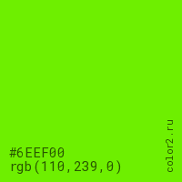 Цвет #6EEF00 в цветовой модели RGB обозначается тремя октетами (110, 239, 0) в десятичном формате и #6EEF00 в шестнадцатиричном (hex) формате, которые являются интенсивностью красного 110 (hex 6E), интенсивность зелёного 239 (hex EF) и интенсивность синего 0 (hex 00).