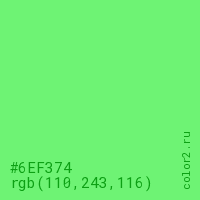 Цвет #6EF374 в цветовой модели RGB обозначается тремя октетами (110, 243, 116) в десятичном формате и #6EF374 в шестнадцатиричном (hex) формате, которые являются интенсивностью красного 110 (hex 6E), интенсивность зелёного 243 (hex F3) и интенсивность синего 116 (hex 74).